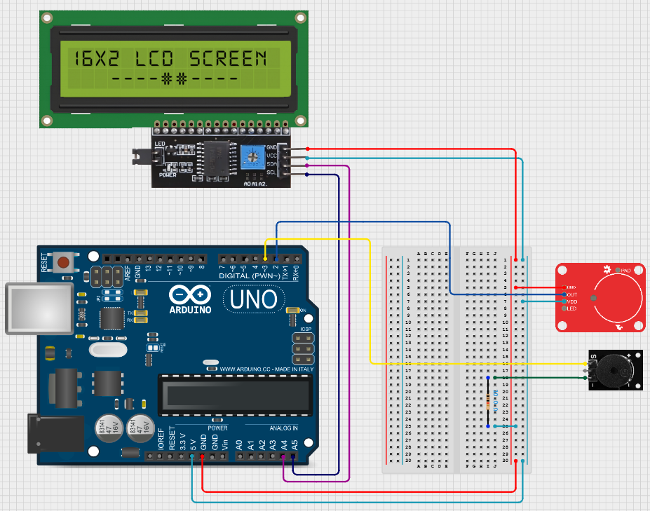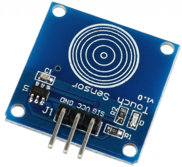 Iremos conectar o pino “VCC” do sensor de toque no positivo (barramento azul da protoboard) e o “GND” no negativo (barramento vermelho da protoboard). O pino “SIG/OUT3“ deverá ser ligado no pino 2 do arduino. Ao encostar o dedo neste sensor será gerado um sinal elétrico que será comunicado para o arduino.