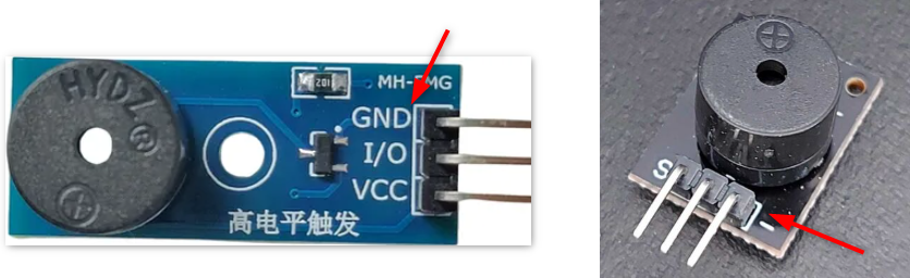 Um dos terminais do resistor de 10 Ohms deve ser ligado no negativo (barramento vermelho da protoboard) e o outro no pino /GND do buzzer. A posição do pino pode variar conforme o fabricante conforme imagem abaixo. Iremos utilizar este resistor para controlar o volume do buzzer.