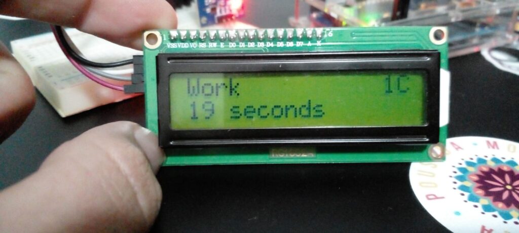 Quando iniciado será exibido o contador, a fase (Work, Break ou Long Break) e o ciclo. A cada virada de ciclo um som será emitido pelo buzzer. A melodia é uma pequena parte do tema Super Mário 😆 que gerei via ChatGpt.
